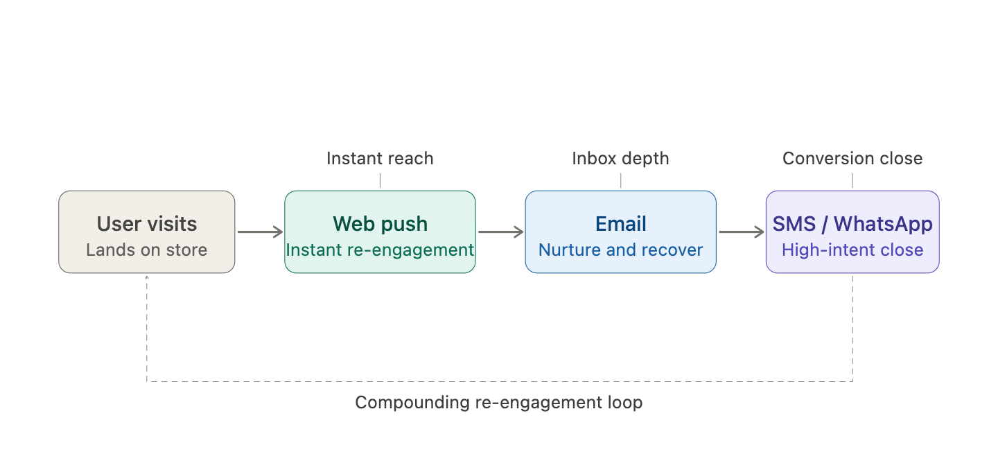 Web push is a channel that performs best when it is used in a larger retention loop. While it is great for instant reach, and time-based nudges on its own, when it is paired with SMS and email it creates a system of compounding engagement and revenue.