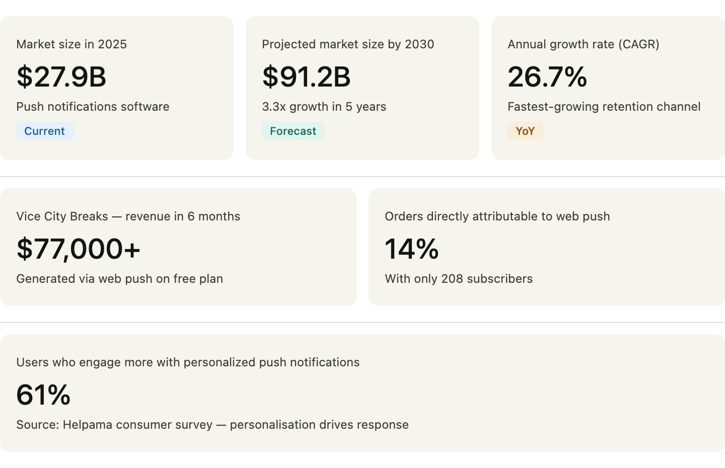 Even as an Industry, web push is being paid a lot of attention. The push notifications software market is valued at $27.91 billion in 2025 and is projected to reach $91.22 billion by 2030, growing at a 26.7% annual rate. This is a growth trajectory that happens only when a channel is constantly showcasing results. And these results are very visible in e-commerce use cases.